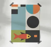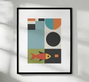 Une composition géométrique présente un poisson orange stylisé sur un fond de rectangles et de cercles colorés, mêlant des nuances de sarcelle, de noir et de vert. Les formes audacieuses et les couleurs contrastées créent une esthétique moderne et abstraite.