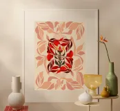 Une grappe vibrante de feuilles rouges est magnifiquement encadrée dans un arc beige, lui-même placé sur un fond rouge, créant ainsi une œuvre d'art botanique stratifiée et sophistiquée.
