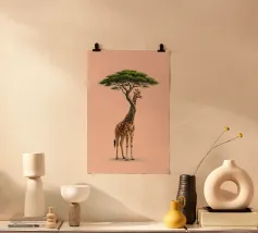 Impression artistique encadrée en bois représentant une girafe originale avec un nuage, parfaite pour décorer une chambre d'enfant ou une salle de jeux. Style moderne et ludique adapté aux espaces enfantins, idéale pour offrir un cadeau de naissance ou anniversaire. Qualité d'impression haute définition sur papier mat 200 GSM avec cadre en bois naturel certifié, fabriquée en Europe.