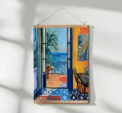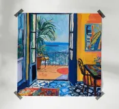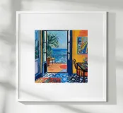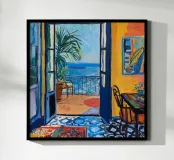 Transportez-vous dans une retraite côtière ensoleillée grâce à cette impression vibrante et expressive d'une vue de bord de mer depuis un intérieur. L'œuvre est peinte avec des coups de pinceau audacieux et une palette intense de jaunes, d'oranges, de bleus et de verts, représentant une pièce s'ouvrant sur un balcon surplombant la mer étincelante. Le style capture la chaleur et la lumière d'une scène méditerranéenne, rappelant le fauvisme. Produite en tant qu'impression d'art numérique de haute qualité avec une résolution impressionnante de 7000x5000 pixels à 300 dpi, elle garantit un niveau de détail exceptionnel et une fidélité à la texture et aux couleurs d'origine, convenant à l'impression en divers formats.
