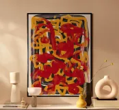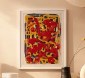 Des coups de pinceau d'un rouge et d'un jaune vifs dominent la scène, sur un fond noir contrasté ressemblant à un cadre. La nature chaotique et abstraite des coups de pinceau suggère un sentiment de mouvement énergique ou peut-être une explosion émotionnelle incontrôlée.