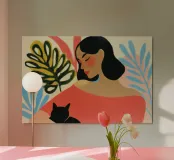 Ce motif transmet chaleur et sécurité : au centre se trouve une femme aux yeux fermés, qui se repose en tendre harmonie avec un chat noir. Le langage des formes doux et réduit rappelle l'expressivité stylisée du modernisme. L'application de la couleur semble douce et structurée - avec un fond pastel et le rouge corail vif de la robe qui confère à la scène un sentiment de vivacité. Des plantes tropicales avec des formes de feuilles décoratives encadrent le motif. Une image qui offre une tranquillité visuelle et célèbre la beauté des petits moments tranquilles.