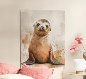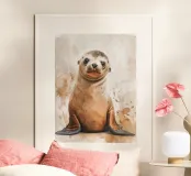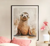 Mignon bébé phoque se reposant sur un rivage sablonneux avec une douce aquarelle poster avec cadre en aluminium