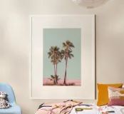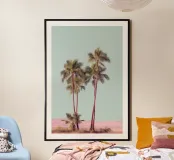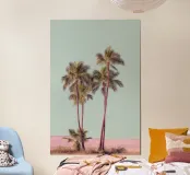 Une composition paisible mettant en scène d'élégants palmiers sur fond de ciel pastel et de montagnes désertiques lointaines. Cette œuvre d'art minimaliste évoque la sérénité et la beauté intemporelle, parfaite pour une décoration d'intérieur moderne.