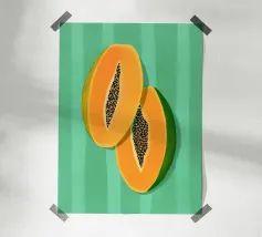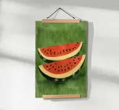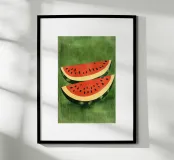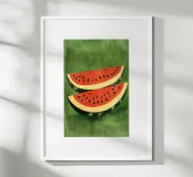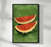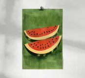 Sur l'image, on peut voir deux tranches de pastèque très stylisées sur un fond vert saturé. Les couleurs vives - rouge vif avec des pépins noirs, une peau jaune et un extérieur vert foncé - semblent délibérément simplifiées et graphiques. L'ensemble de la représentation a une touche moderne, presque pop, avec des lignes claires et un langage formel réduit. Elle rappelle un motif estival frappant qui donne envie de jours chauds et de fruits frais.