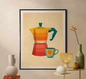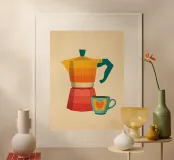 A vibrant celebration of coffee culture, this artwork captures the essence of that perfect morning ritual. Featuring a retro-inspired moka pot in bold hues of orange and pink, paired with a playful mug, it’s a visual love letter to coffee lovers everywhere. The warm tones and whimsical design invite you to savor every sip. Perfect for adding a splash of color and personality to any space, this piece is a must-have for those who can’t start their day without that essential cup of jo