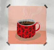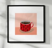 Illustration en gros plan d'une tasse de café ou de thé chaude et fumante dans une tasse rouge vif au motif détaillé et complexe. Cette œuvre d'art confortable et détaillée est une invitation chaleureuse à faire une pause.