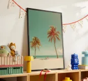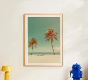 Cette superbe affiche illustre une scène de plage nostalgique de style rétro. L'image représente deux palmiers élégants sur une plage de sable immaculé, dont les feuilles s'illuminent d'une lueur chaude et ensoleillée. L'océan turquoise rencontre un ciel bleu clair, créant une toile de fond paisible et accueillante. Un filtre vintage subtil ajoute un charme intemporel et une nostalgie chaleureuse, ce qui rend cette pièce parfaite pour une maison au thème bohème ou rétro. Ce téléchargement numérique de haute qualité (7000x5000 pixels, 300 dpi) garantit une impression magnifique et détaillée, apportant des vibrations estivales dans n'importe quel espace.