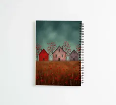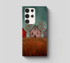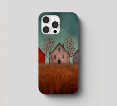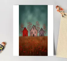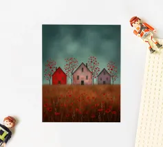 Three silent shapes against the breeze, Standing still on the edge of time, With windows like heavy, shuttered eyes O’er a field of poppies and sighs. The earth burns with an ancient red, While the sky, in its weary green, Rests on the roofs like a secret unsaid. No footstep falls, no voice is heard, Only the wait for those long gone, Midst barren trees with blossoms of blood.