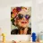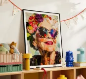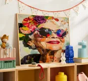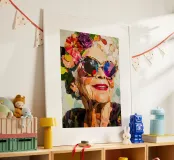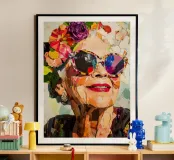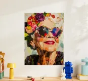 Un collage abstrait moderne représente une femme âgée portant des lunettes de soleil audacieuses, respirant la confiance et le style. La composition est dynamique, avec des fleurs découpées dans des couleurs vives et ludiques comme l'orange, le jaune et le violet, éparpillées autour d'elle. Son visage est simplifié, l'accent étant mis sur l'expression plutôt que sur les détails. L'arrière-plan rose ajoute un contraste dynamique, renforçant l'énergie vive de l'œuvre. Les éléments abstraits et superposés créent une impression de mouvement et d'amusement, alliant l'art moderne à un sentiment d'intemporalité et d'individualité.