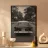 Vue arrière d'une voiture classique dans une rue en noir et blanc poster avec cadre en plastique
