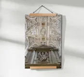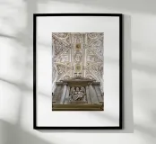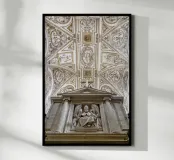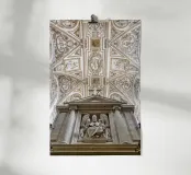 La photo montre une impressionnante voûte de plafond dans la cathédrale de la grande mosquée de Cordoue, un important symbole architectural de l'Espagne. Le plafond se distingue par des stucs artistiques et des reliefs richement décorés représentant des scènes religieuses et historiques. Au centre de la composition trône un retable monumental avec une figure sainte assise, flanquée de colonnes classiques et d'éléments décoratifs. Les couleurs d'or, d'ivoire et de blanc confèrent à la pièce un aspect solennel et sublime.