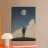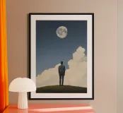 Un homme en costume se tient sur une colline, vue de dos, regardant la pleine lune dans le ciel, avec des nuages blancs autour de lui. Le style est une peinture surréaliste, une illustration minimaliste avec un fond propre, une haute résolution et une palette de couleurs claires et douces qui créent une atmosphère rêveuse avec un haut niveau de détail.