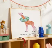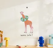 Girafe amusante avec flotteur de natation et écriture d'enfant. Salle de bain amusante, salle de bain pour enfants, art mural pour enfants.