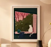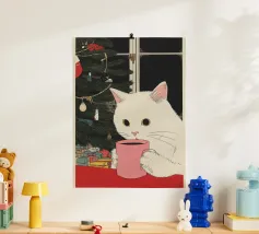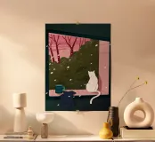 Cette peinture représente un chat blanc assis sur le rebord d'une fenêtre, regardant un paysage enneigé avec des arbres dénudés. L'intérieur est douillet, avec une tasse et un vêtement sur le rebord de la fenêtre, ce qui suggère la chaleur et le confort à l'intérieur.