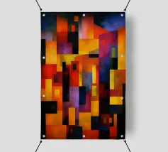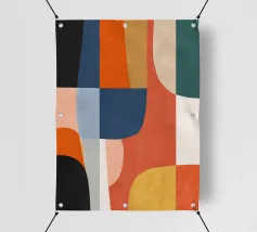 Une composition abstraite riche et contemporaine, construite à partir de formes géométriques superposées et de couleurs profondes et atmosphériques. Les courbes et les blocs s'entrecroisent dans un agencement soigneusement équilibré, créant une impression de rythme architectural et de profondeur visuelle. La texture de la surface ajoute une chaleur subtile et picturale, adoucissant la géométrie et donnant à l'œuvre une présence tactile et artisanale.