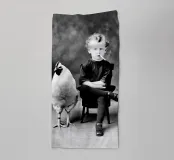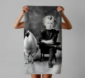 Garçon et poulet, drôle de photo ancienne en noir et blanc