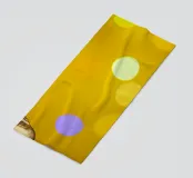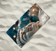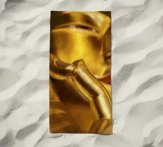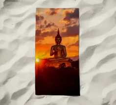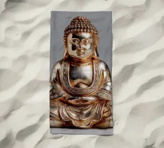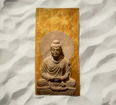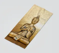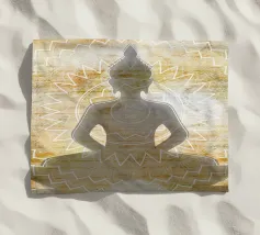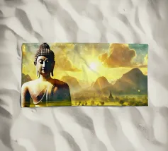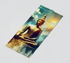 L'image montre une statue de Bouddha dorée sur un fond jaune vif avec plusieurs cercles de lumière. La statue est travaillée en détail et montre Bouddha dans une posture méditative, les mains jointes. La surface de la statue est brillante et structurée, avec des ornements visibles sur la robe. L'arrière-plan est composé d'un jaune intense, complété par des reflets de lumière colorés qui créent une profondeur visuelle et font ressortir la figure.