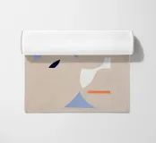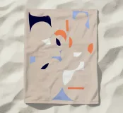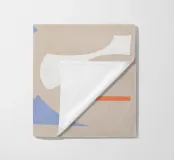 Des formes abstraites sont disposées sur un fond pâle, créant une composition qui suggère un profil facial fragmenté. Des couleurs vives telles que le bleu, l'orange et le noir sont utilisées pour les éléments géométriques, contrastant avec la toile de fond subtile.
