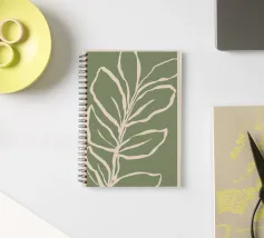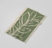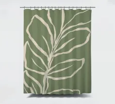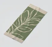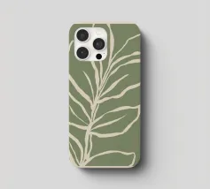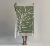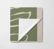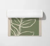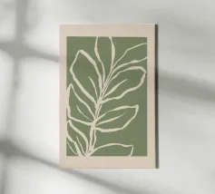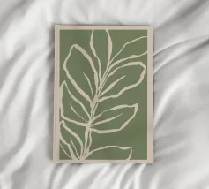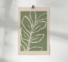 Tableau abstrait dessiné à la main représentant une feuille beige aux contours marqués sur un fond vert sauge uni.