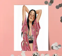 Cette œuvre d'art représente une personne vêtue d'un haut à fleurs jaune vif et d'un pantalon bleu, prenant une pose dynamique sur un fond rose à motifs floraux orange.