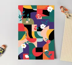 Une composition abstraite ludique et énergique composée de différentes taches de couleur et de motifs, notamment des fleurs, des grilles et des rayures, comme une courtepointe vibrante.