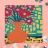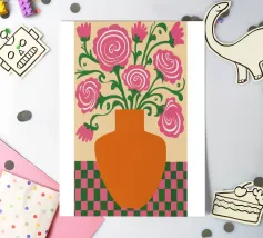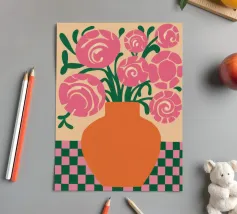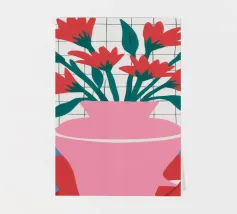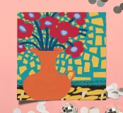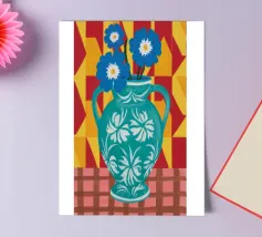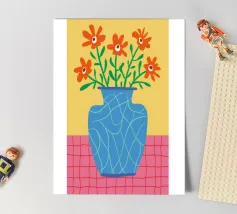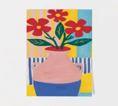 A joyful still life of a bouquet of red poppies in a terracotta vase, set against a cheerful, patchwork like background of yellow and blue tiles.