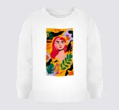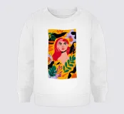 A portrait of a woman with flowing red hair, surrounded by stylized leaves and flowers, looking thoughtfully to the side. The style is modern, bold, and slightly art nouveau.