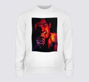 Représentation dynamique et colorée d'un homme chantant passionnément dans un microphone. L'éclairage intense de la scène met en valeur ses traits expressifs et son physique musclé.
