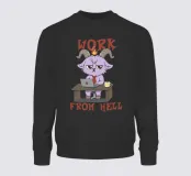 A purple demon goat in a tie sits at a desk with a laptop and coffee, under the phrase “Work From Hell.” The artwork makes a clever pun on daily work feeling like hell, with the demon literally working from hell. Ideal for fans of dark humor, sarcastic office jokes, and anyone who wants to laugh at work struggles.