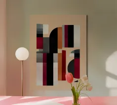 Une composition abstraite riche et contemporaine, construite à partir de formes géométriques superposées et de couleurs profondes et atmosphériques. Les courbes et les blocs s'entrecroisent dans un agencement soigneusement équilibré, créant une impression de rythme architectural et de profondeur visuelle. La texture de la surface ajoute une chaleur subtile et picturale, adoucissant la géométrie et donnant à l'œuvre une présence tactile et artisanale.