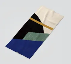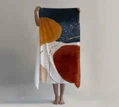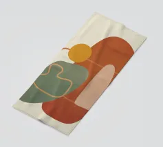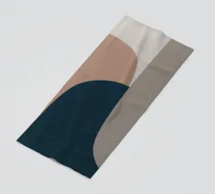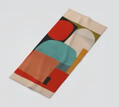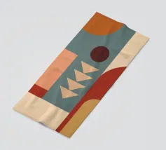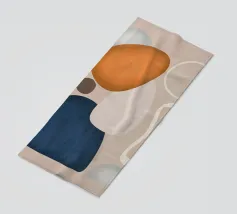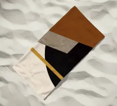 Les formes géométriques et les tons terreux créent un design moderne avec des lignes et des formes abstraites. La composition comprend des rectangles qui se chevauchent et un demi-cercle, soulignés par des accents dorés.