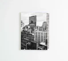 Stunning black and white photograph captures the Manhattan skyline, showing the towering skyscrapers and their elegant facades in a geometric composition from an aerial perspective. With visible reflections in daylight, this luxury poster epitomises modern artistry and is a stylish addition to contemporary interiors.