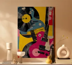 A modern abstract painting featuring geometric shapes forming guitars, violins, and musical notes in a bold, colorful composition. The textured background and dynamic arrangement evoke a sense of rhythm and artistic expression.
