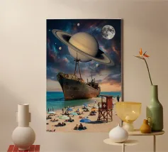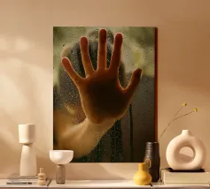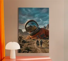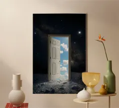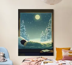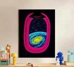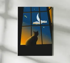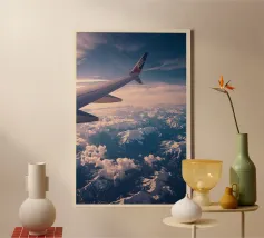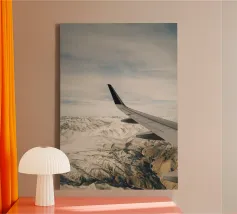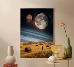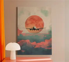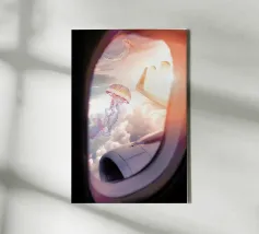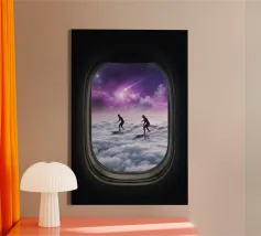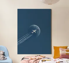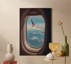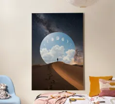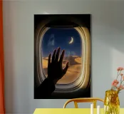 Découvrez la magie du voyage et du ciel nocturne grâce à cette œuvre d'art atmosphérique représentant une main qui touche délicatement le hublot d'un avion surplombant des dunes désertiques rougeoyantes. Un croissant de lune brille dans un ciel bleu profond rempli d'étoiles, créant un mélange serein d'errance et d'émerveillement. Les sables chauds et dorés contrastent magnifiquement avec les tons frais de la nuit, capturant le sentiment de solitude, de réflexion et de rêve au-dessus du monde. Parfait pour les amateurs de voyages, les minimalistes et les fans d'art cinématographique et de vues de fenêtre rêveuses.