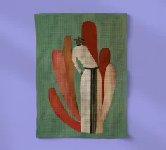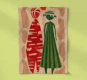 Illustration abstraite de deux personnages stylisés portant des vêtements rouges et verts aux motifs audacieux, dont les formes sont simplifiées et élégantes.