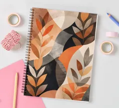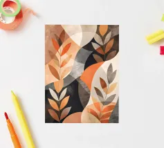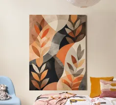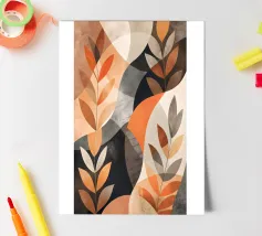 Cette œuvre d'art abstraite présente des teintes vibrantes d'orange, de marron et de gris, créant une atmosphère chaleureuse et accueillante. Les formes organiques et les motifs en forme de feuilles évoquent la nature et la tranquillité. Parfait pour ajouter une touche de charme automnal à n'importe quel espace.