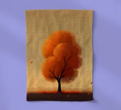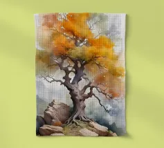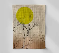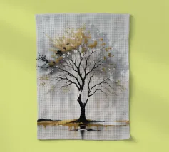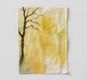Un grand arbre dénudé se dresse seul sur un fond jaune doux, mettant en valeur un effet d'aquarelle artistique. Les branches s'étendent vers le haut, créant une silhouette saisissante.