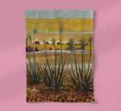 Les plantes éparses du désert résistent à la lumière vive et aux tons ocre, évoquant la solitude et la survie.
