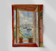 Vue à travers une fenêtre ouverte avec des volets bleus, révélant un balcon ensoleillé avec une plante en pot donnant sur une mer azur étincelante et une terre lointaine.