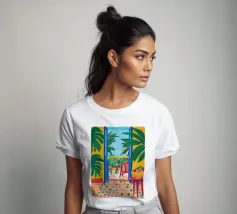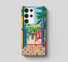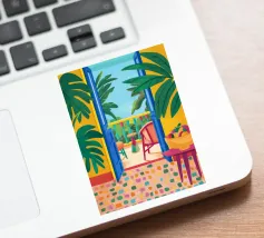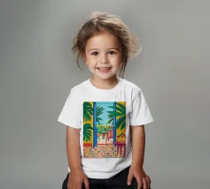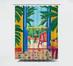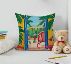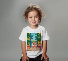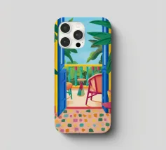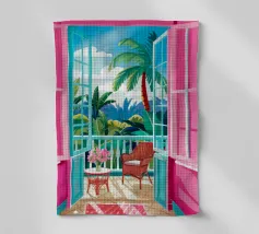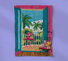 Vue d'un balcon carrelé, rempli de plantes d'intérieur luxuriantes, donnant sur un extérieur vibrant et verdoyant. La scène est une belle fusion d'une jungle intérieure et extérieure, pleine de vie et d'énergie sereine.