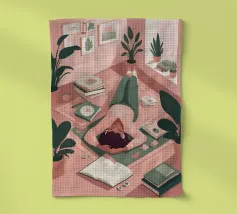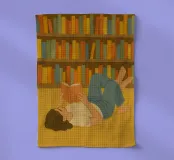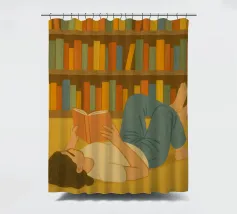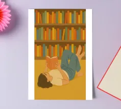Un moment confortable pour tout lecteur - allongé, un livre à la main, perdu au milieu de rangées de dos colorés. Des tons chauds et terreux et un charme simple donnent vie à cette scène de lecture, parfaite pour tout coin qui célèbre les histoires, les après-midi calmes et la joie tranquille.