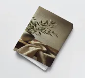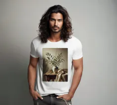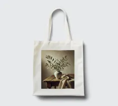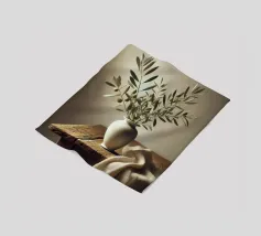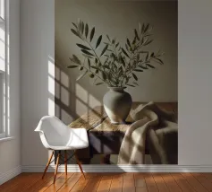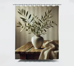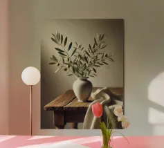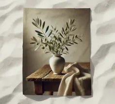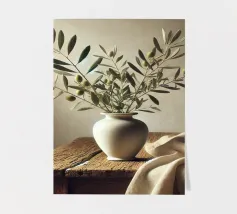 Une nature morte rustique présentant une table en bois ornée d'un simple vase de branches d'olivier, baignée d'une douce lumière naturelle, évoquant le charme méditerranéen et l'élégance intemporelle.