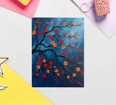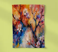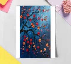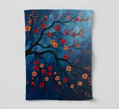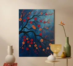 Cette œuvre d'art saisissante capture la beauté des branches en fleurs sur un fond bleu profond et texturé. Le contraste entre les fleurs d'un rouge et d'un orange éclatants et les branches sombres crée une scène dramatique et captivante. Le style de la peinture évoque à la fois la sérénité et l'énergie, ce qui en fait une pièce parfaite pour ajouter une touche de nature et de couleur à n'importe quel espace. Le fond texturé ajoute de la profondeur et de l'intérêt visuel, ce qui en fait une pièce unique qui attire l'attention.