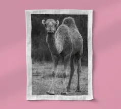 Portrait of a camel. In black and white. Walking through the desert in Ethiopia. Animal in the nature of the Danakil depression in Africa.
