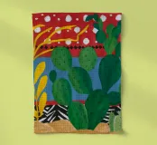 Une collection vibrante de cactus stylisés dans des pots colorés est placée sur un fond rouge audacieux présentant un motif fantaisiste de lumières ou de perles, créant ainsi une composition botanique ludique et moderne.