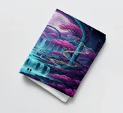 Cascade enchantée au clair de lune. Un paysage surréaliste présente des cascades en cascade sous une grande lune brillante. Les arbres de fleur de cerisier avec un feuillage rose vibrant améliorent la scène.