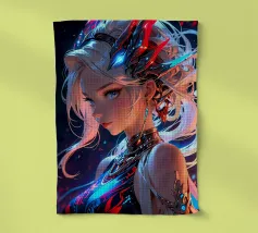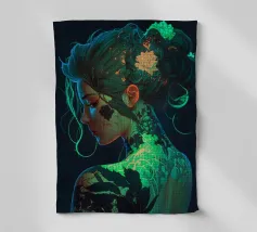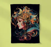 Un portrait fantastique exquis mêlant élégance royale et symbolisme cosmique. Celestial Sovereign représente une puissante figure féminine parée d'une coiffure dorée ornée de motifs lunaires et célestes. Des rubans de turquoise, d'or et de cramoisi s'entrelacent autour d'elle, créant une aura rayonnante de mysticisme et de force. Une célébration de la féminité divine, du style art nouveau et de l'artisanat numérique complexe.