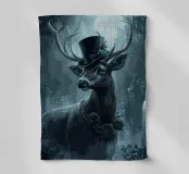 Cette œuvre d'art évocatrice montre un cerf noble aux bois imposants, debout dans une forêt brumeuse. Il porte un chapeau haut de forme noir, orné d'une plume et d'une fleur bleues, ainsi qu'un collier de roses qui lui confèrent une allure mystérieuse, presque aristocratique. Les tons froids de bleu et de gris de l'environnement créent une atmosphère calme, légèrement mystique, qui rend l'animal à la fois majestueux et surréaliste. Ce motif est idéal pour les amateurs de dark art proche de la nature, de représentation surréaliste d'animaux et d'images élégantes et évocatrices.