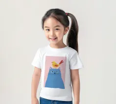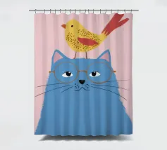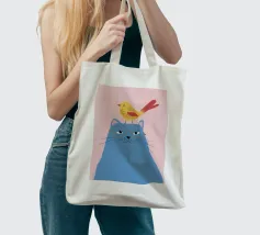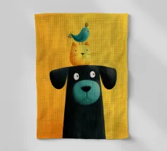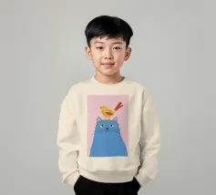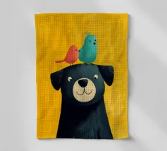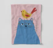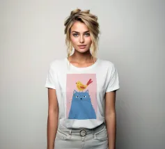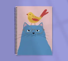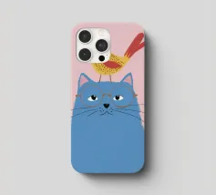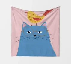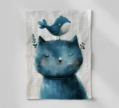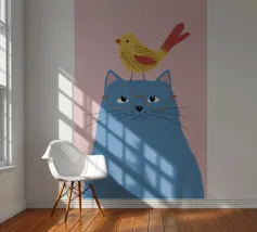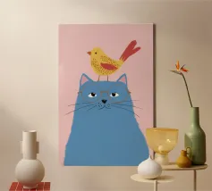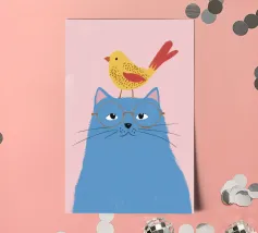 Illustration fantaisiste et charmante d'un grand chat bleu avec un petit oiseau jaune perché paisiblement sur sa tête. La composition est une représentation douce, imaginative et réconfortante d'une amitié improbable.